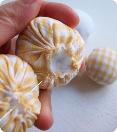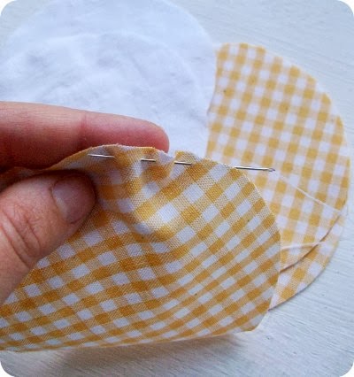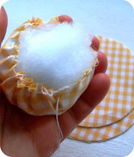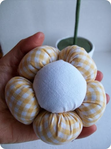 -Vaso de barro pequeno -23 centímetros de palito de churrasco ou bambu -Fita flor Tecidos coloridos -Caneta ou lápis -Agulha e linha -Tesoura -Esponja ou espuma para jarros -Musgo natural -Microfibra para enchimento -Pistola de cola Flor de fuxico com enchimento passo a passo Usando um pires ou tampa redonda como um guia, desenhe e corte 5 círculos de tecido estampado. Aqui foi usado uma tampa de 10 cm de diâmetro. Desenhar e corte mais 2 círculos do tecido branco. Agora você tem sete círculos! Faça um ponto corrido ao redor da borda de cada círculo, como mostrado acima. Quando você passou a toda a volta, puxe a linha um pouco para obter uma pequena “bolsa” e preencha com o enchimento. Termine puxando o saco fechado com um par de pontos. Repetir para todas as outras seis círculos. Agora, para montar a cabeça de flo