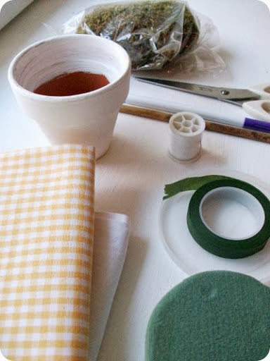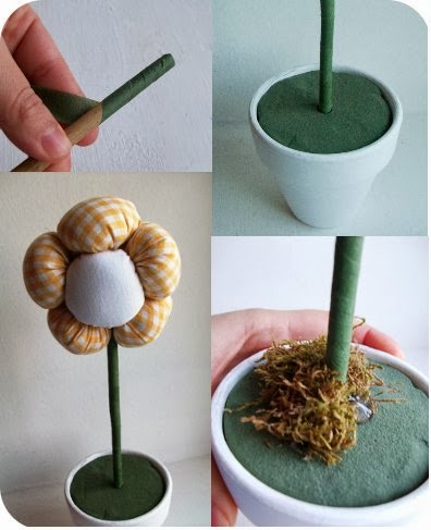 -Fure a esponja floral dentro do vasinho e usando a pistola de cola, colar o talo no centro. -Usando a pistola de cola novamente, colar os musgos para esconder e esponja floral. -Finalmente, puxe cuidadosamente para além de um par de pétalas de flores sobre a cabeça, aplique um pouco de cola quente e fixe-o à haste. -Decore os vasinhos ao seu gosto com pintura, com tecidos, com fitas coloridas. Nesta foi usado um botão de tecido coberto e uma fitinha.